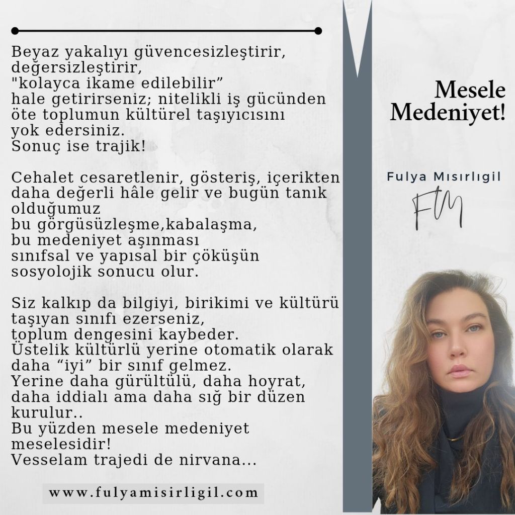 Okumuş, kültürlenmiş, dil bilen, dünya gören, analiz eden, sorgulayan ve toplumsal dengeyi taşıyan kimi zaman burjuvazi, kimi zaman aydın sınıf, kimi zaman şehirli aristokrasi denilen ara sınıf beyaz yaka toplumu yukarıya çeken kültürel omurgadır.